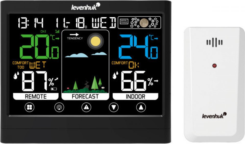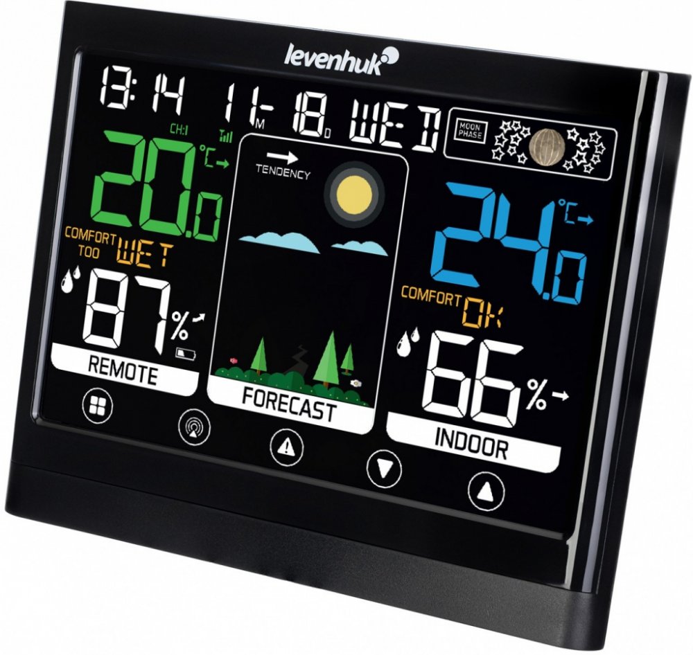 Levenhuk Wezzer Teo TH50 je termohygrometr s dotykovým ovládáním a senzorem dálkového ovládání, který je součástí dodávky. Jeho hlavní funkcí je informovat o teplotě a vlhkosti uvnitř i venku a vyhodnocovat tyto dva parametry pro kontrolu povětrnostních podmínek a hlášení negativních trendů. Každý ví, že extrémní výkyvy vlhkosti mohou zhoršit chronická onemocnění a příliš nízké nebo vysoké teploty mohou negativně ovlivnit zdraví – tyto parametry je třeba velmi pečlivě sledovat. Naměřené hodnoty se zobrazují na vestavěné barevné obrazovce. Vlevo vidíte údaje ze senzoru dálkového ovládání a vpravo z hlavního modulu. Číslice jsou velké, kontrastní, dobře viditelné z velké vzdálenosti a pro lepší čitelnost barevně odlišené. Uprostřed obrazovky se zobrazují trendy ve vývoji počasí a předpověď počasí prostřednictvím barevné grafiky, ze které lze snadno vyčíst, zda bude slunečno nebo zataženo. Malý pruh v horní části obrazovky zobrazuje čas, datum, den v týdnu a fázi Měsíce. K dispozici je také budík s funkcí opakovaného buzení. Údaje se přenášejí prostřednictvím rádiového kanálu.