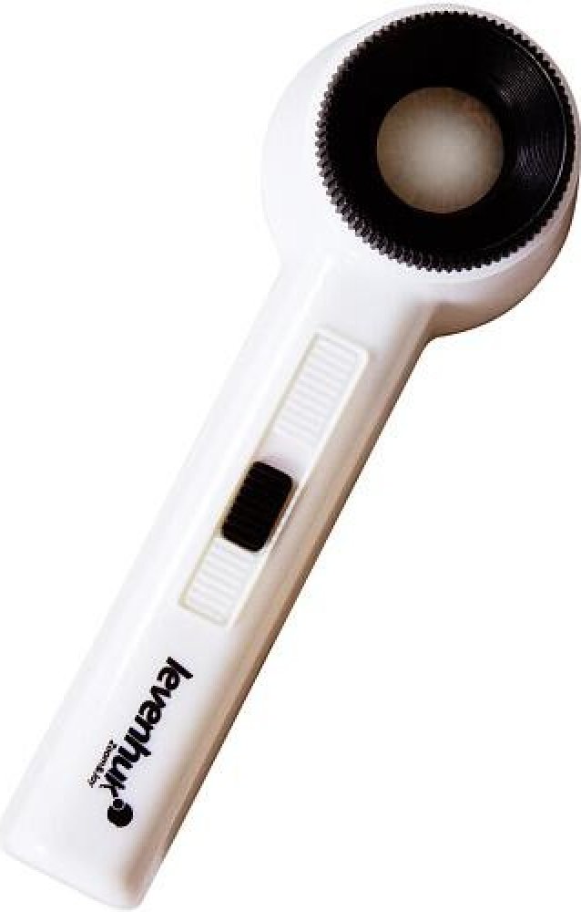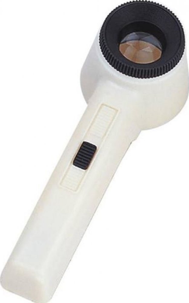 Světelný spínač je umístěn na rukojeti a jeho poloha se dá snadno měnit prstem. Tato lupa se zvětšením 10x je ideální pro studium drobných objektů a dekódování malého písma.