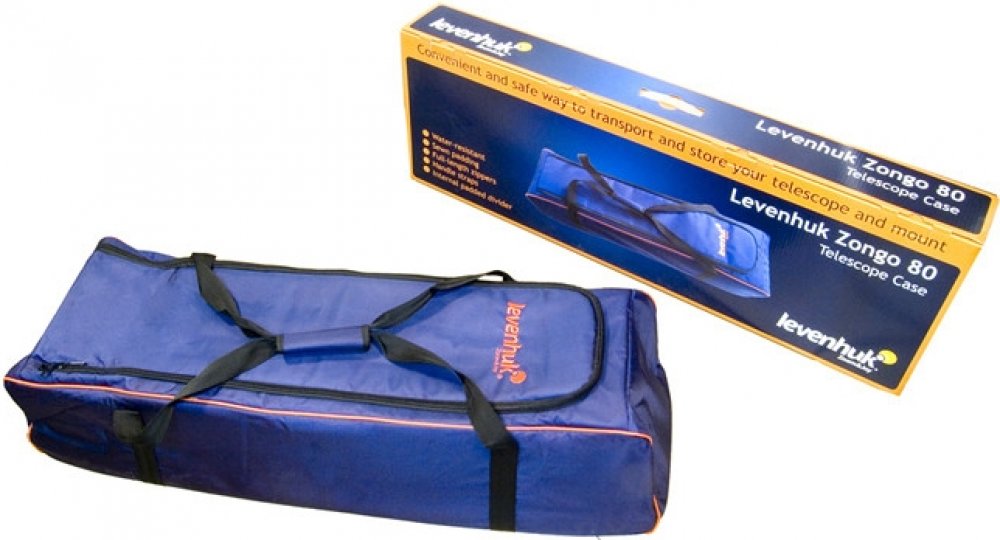 Brašna Levenhuk Zongo 80 bude vynikající pomůckou pro každého, kdo za pozorováním hvězd často vyráží do přírody. Lze ji používat společně s různými teleskopy, jako je Levenhuk Skyline PRO 105 MAK, Levenhuk Skyline 120x1000 EQ, Levenhuk SkyMatic 105 GT MAK GoTo, Bresser National Geographic 114/900 AZ a podobné modely. Do velké přihrádky v této brašně lze vložit samotný tubus teleskopu spolu s montáží, přihrádkou na příslušenství a stativem. Vnitřní polstrovaná přepážka oddělí tubus od montáže a stativu, zatímco suché zipy udrží na místě protiváhy, díky čemuž je váš teleskop chráněn před jakýmikoli nárazy. Při balení stativu doporučujeme do pouzdra nejprve zasunout jeho horní část a potom jednu po druhé uložit nohy stativu. Brašnu můžete nést za rukojeti v ruce, nebo ji na širokém popruhu zavěsit přes rameno. Dokonce i barevnou krabici, v níž se brašna dodává, lze snadno přenášet za rukojeť. Tato brašna váš teleskop spolehlivě ochrání před veškerými nárazy při transportu i před prachem a vlhkostí během skladování.