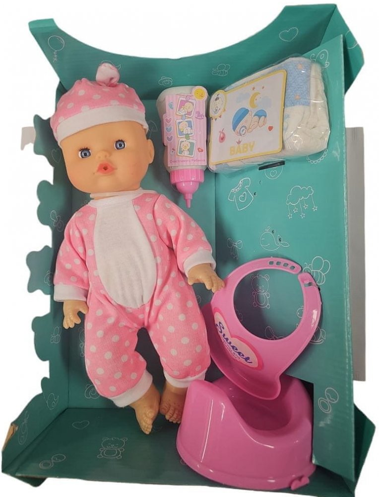 Miminko panenka – pije čůrá zpívá s příslušenstvím. Tato roztomilá panenka, miminko ve stylovém krásném miminkovském oblečení , která po stisknutí na břiše vydává zpěv. Obsahuje lahvičku na pití, dudlík, nočník, plastový bryndáček a plínku . Vhodné od 3 let. V ústech panenky je otvor, ta