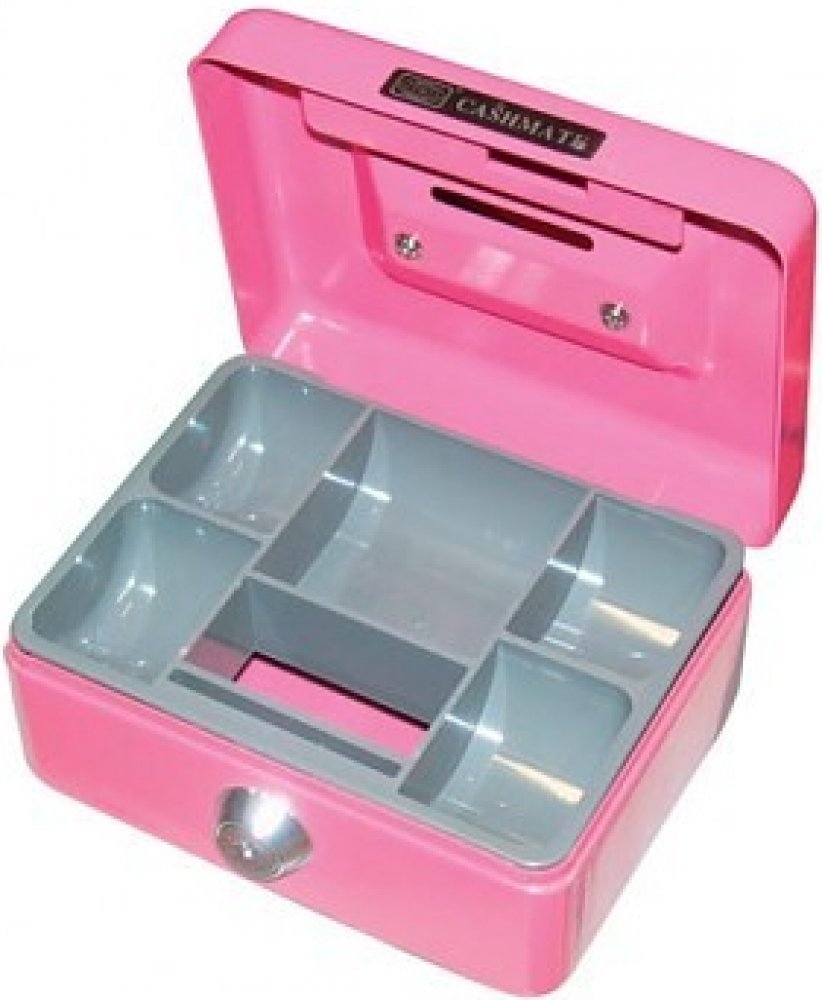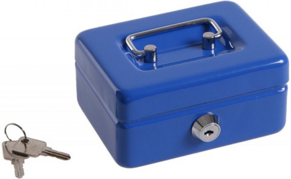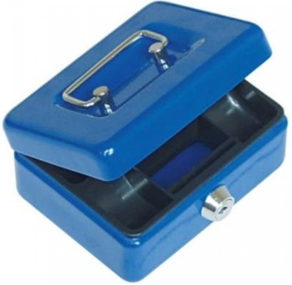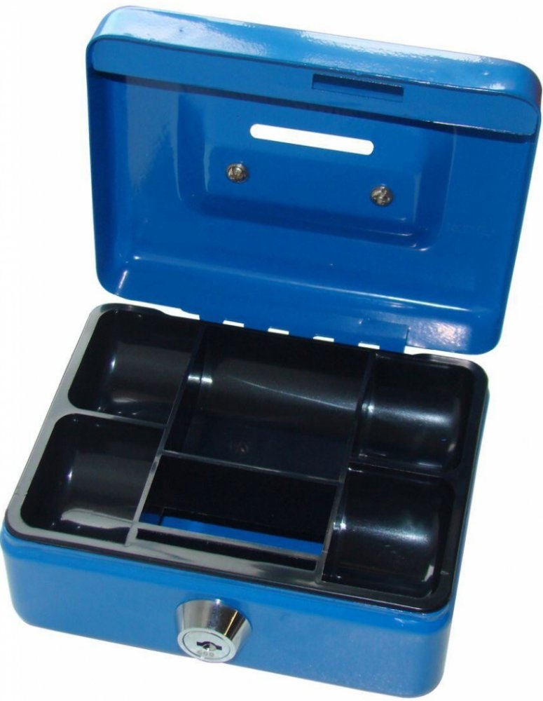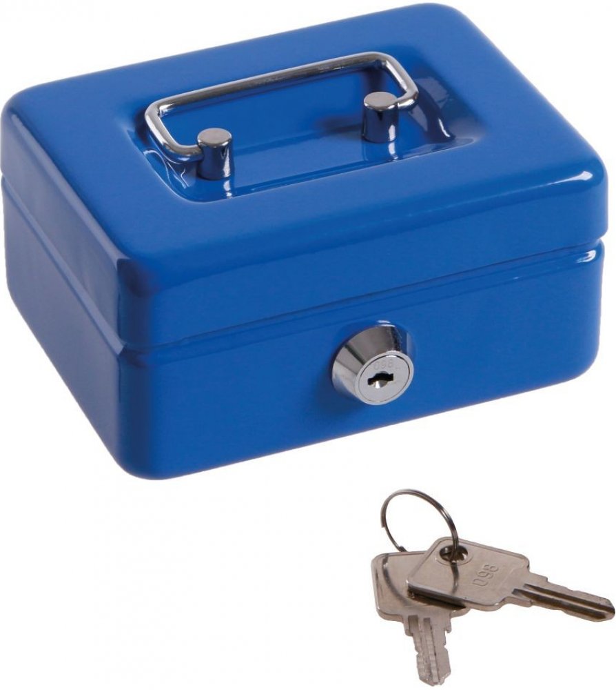 Kovová přenosná pokladna s plastovým mincovníkem. Praktická, lehká, uzamykatelná pokladna s pevným madlem na snadné přenášení. Otvor pro vhazování mincí.