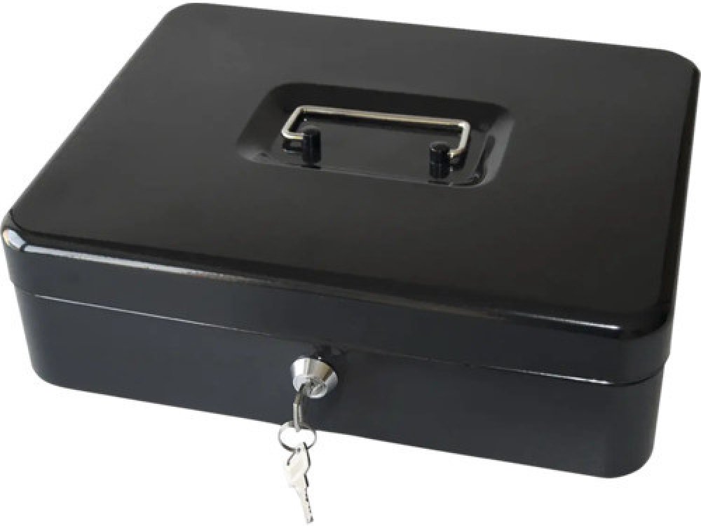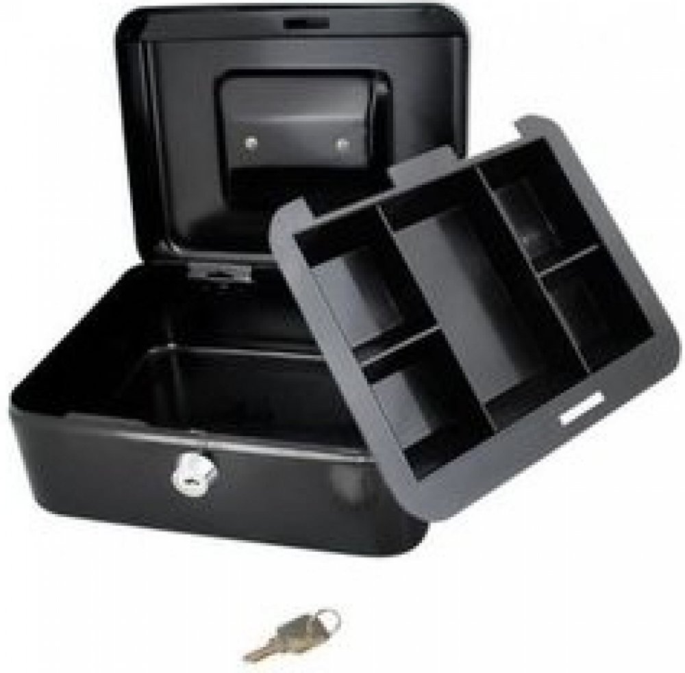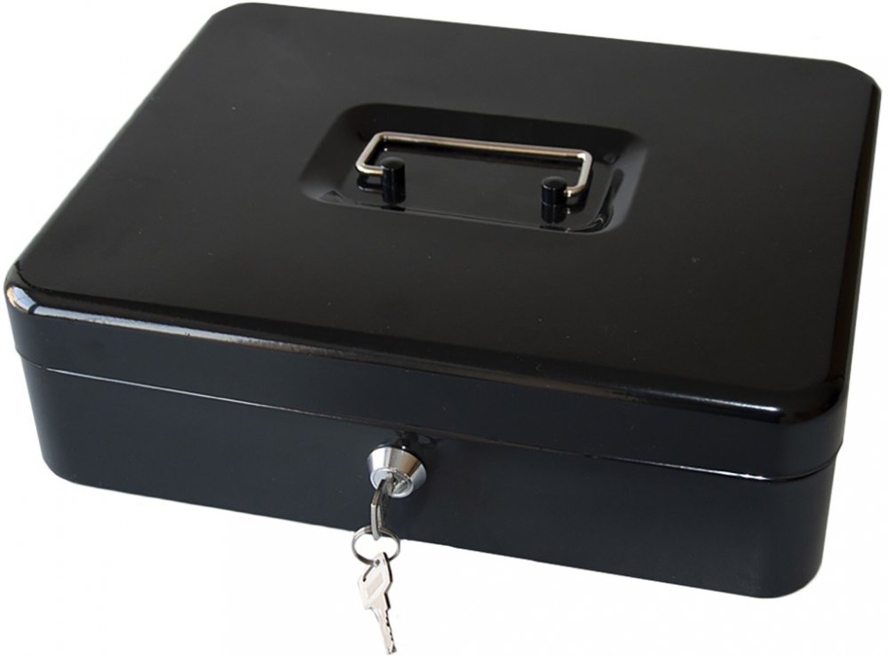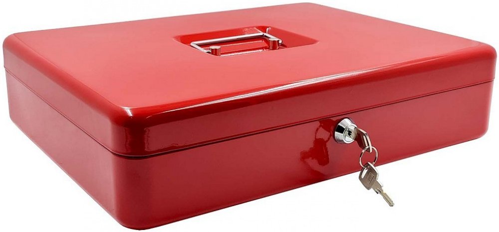 Kovová přenosná pokladna s plastovým mincovníkem. Praktická, lehká, uzamykatelná pokladna s pevným madlem na snadné přenášení.