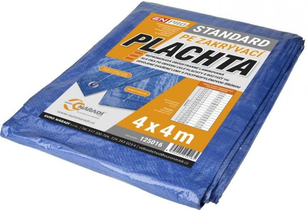 PE plachta 4x4/70 modr/stř Nepromokavá zakrývací PE plachta, garantovaná gramáž 70 g / m2 barevné provedení modro-stříbrná materiál - PE vlákna o vysoké hustotě, počet přízí na čtvereční palec - 7x7, jemnost příze: 600 denier, oboustraně laminovaná, zesílené rohy ochrana proti UV záření hmotnost 1120g