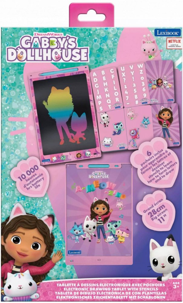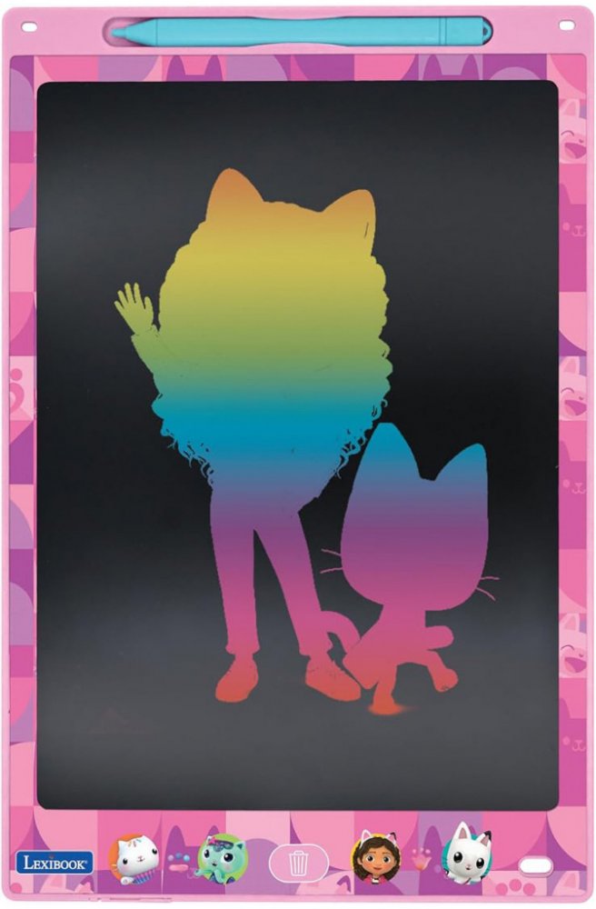 Kreslicí tablet s elektronickým inkoustem Lexibook otevře dětem svět plný kreativní zábavy a učení. Velká 11" LCD obrazovka poskytuje dostatek prostoru pro všechny jejich nápady. Citlivě reaguje na tlak, takže děti mohou jednoduše měnit tloušťku čar. Veselé šablony s obrázky kamarádů z Gábinina kouzelného domečku, čísel a písmen skvěle poslouží při nácviku kreslení a psaní. Stisknutím jediného tlačítka se obsah smaže, takže mohou děti ihned začít tvořit od začátku. Proti nechtěnému vymazání uměleckých výtvorů je dětský tablet opatřen zámkem. Díky lehkému a odolnému provedení je zařízení ideální na cesty, děti si ho mohou vzít s sebou do školy nebo na výlet. Stylus má praktické úložné místo přímo na tabletu, takže je vždy po ruce.Kreslicí tablet Lexibook šetří nejen papír, ale představuje skvělý nástroj pro rozvoj kreativity a jemné motoriky. Funguje na jednu baterii CR2025 a díky krásnému designu s motivem oblíbeného seriálu Gabby Dollhouse si jej zamilují holčičky od 3 let....