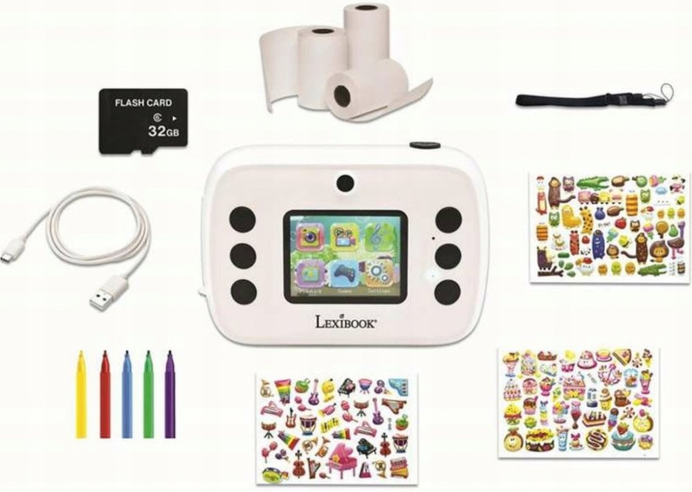 Nechte děti zachytit nezapomenutelné okamžiky s fotoaparátem Lexibook StarCAM, který okamžitě tiskne černobílé fotografie na termopapír. Navíc nahrává videa, přehrává hudbu a nabízí hraní her – to vše v jednom. SD karta je součástí balení. S tímto fantastickým instantním fotoaparátem děti zachytí všechny nezapomenutelné momenty, a navíc úsporně. Kvalitní HD fotografie mohou okamžitě vytisknout v černobílých barvách na termopapír (podobný běžným účtenkám) o rozměrech 2" × 4" (přibližně 5 × 10 cm). Tři přiložené rolky papíru umožňují tisk až 250 fotografií. Fotoaparát nabízí skvělé funkce, jako je nastavení velikosti fotografie, kvality tisku a přednastavené fotorámečky, které dodají vytvořeným vzpomínkám originalitu. V balení dále najdete 3 archy s celkově 170 3D samolepkami a 5 fixů, které dětem umožní kreativně vyzdobit své vytištěné fotografie v albu. Kromě fotografií lze navíc zachytit i videa v HD kvalitě a nastavit jejich rozlišení nebo rychlost. S 32GB SD kartou může instantní fotoaparát uložit až 30...