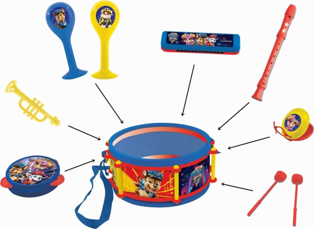 Tato sedmidílná hudební sada je skvělým začátkem pro ty nejmenší při seznamování se s rytmy a hudbou. Sada obsahuje buben, kastaněty, harmoniku, flétnu, trubku, pár maracasů (rumba koulí), malou tamburínu a dvě paličky. Všechny nástroje lze bezpečně uložit do velkého bubnu s víkem pro snadné skladování a přepravu, což oceníte při cestování nebo přenášení. Děti si užijí spoustu legrace, která zárov...
