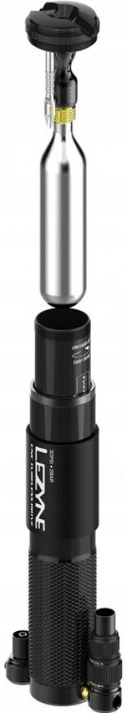 Kompaktní systém kombinuje soupravu pro opravu bezdušových pneumatik, hustilku CO2 a velkoobjemovou ruční pumpu - vše pohodlně umístěné v lehké opracované hliníkové konstrukci.