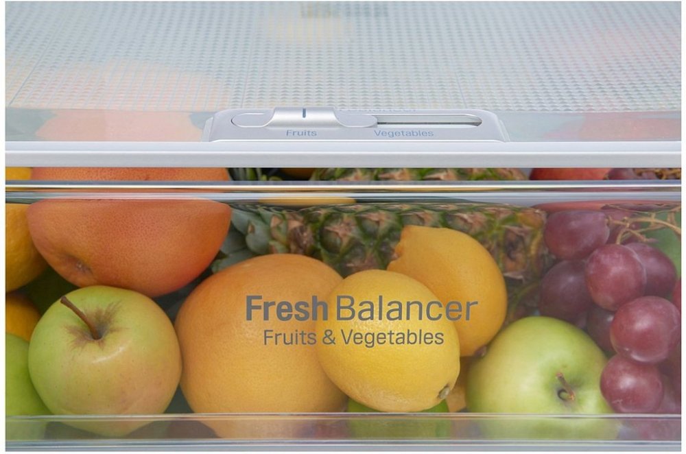 Pro čerstvost ovoce a zeleniny uložených v lednici je klíčové udržet správnou úroveň vlhkosti. Zásuvka FRESH Balancer je vybavena jednoduchým posuvným tlačítkem, které reguluje optimální vlhkost pro skladování ovoce i zeleniny, takže si déle zachovají svou čerstvost.