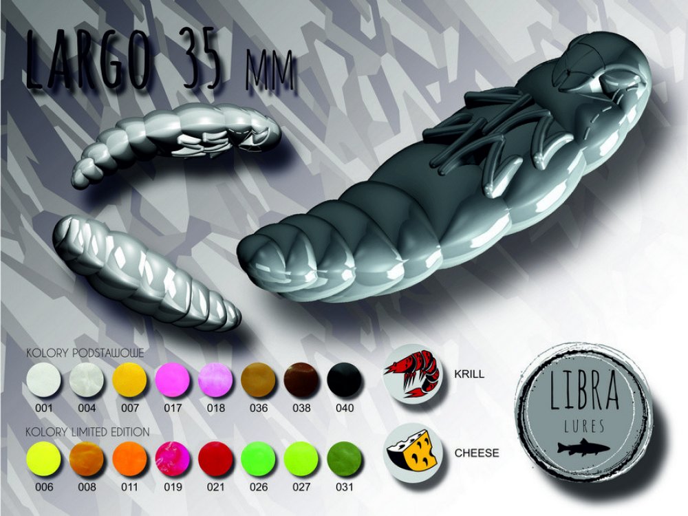 Largo je věrná napodobenina bezkřídlého hmyzu, který jsou základní potravou mnoha druhů ryb. Tuto nástrahu navrhl mistr světa v lovu pstruhů Tomasz Podkul (Francie 2019) pro rybolov v řekách i ve stojatých vodách - Trout Area.