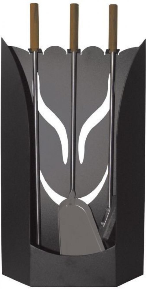 Souprava krbového nářadí Lienbacher 21.02.374.2, v kombinaci smetáček, lopatka a pohrabáč. Madla nářadí jsou z ořechového dřeva, držák nářadí lze umístit volně nastojato či jej lze upevnit na zeď.