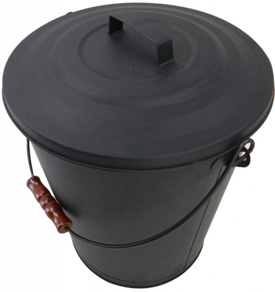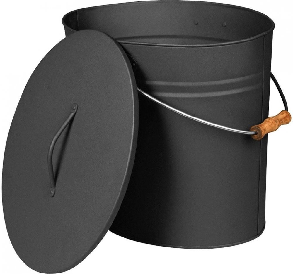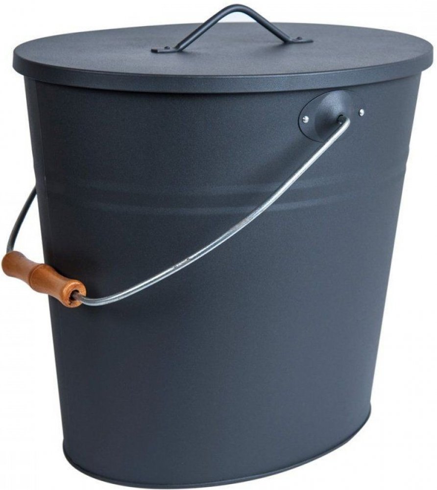 Kovová oválná nádoba na popel s víkem. Nádoba má dřevěnou rukojeť pro pohodlnou manipulaci.
