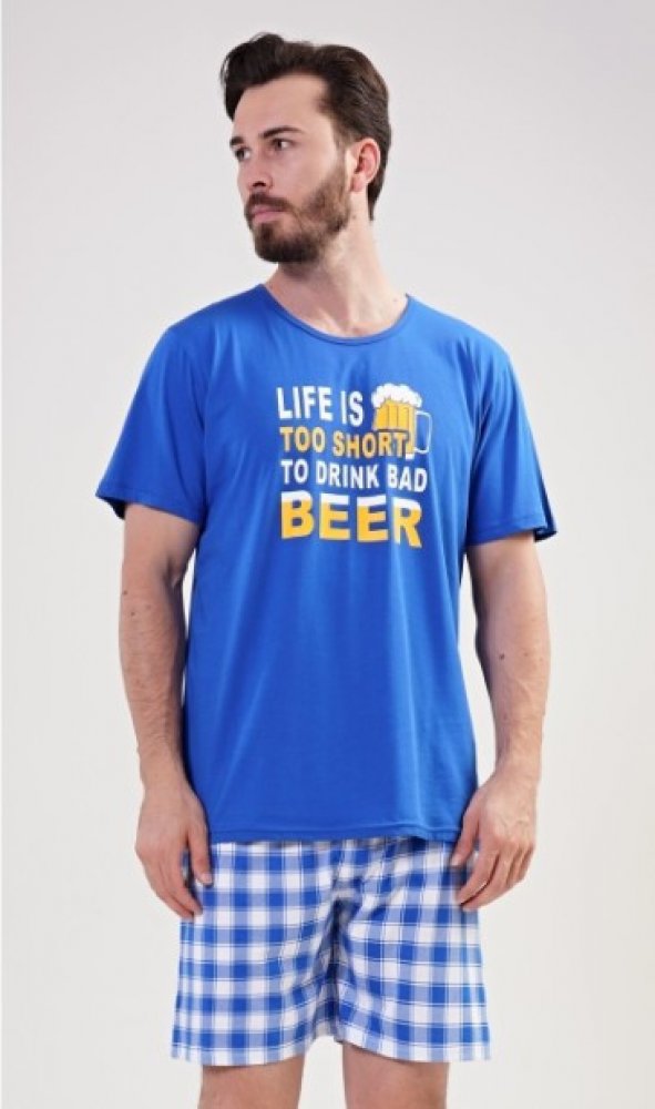 Pánské bavlněné pyžamo šotky Life is beer. Pánské pyžamo se skládá z trička s krátkým rukávem a krátkých šortkových kalhot. Na tričku je nápis Life is too short to drink bad beer. Výrazné tričko vhodně doplňují kostkované kalhoty. Šortky jsou bez kapes, mají gumu a šňůrku na stažení. Použitý materiál s podílem bavlny 100% je příjemný a poddajný na dotek. Pyžamo je vhodné i na denní nošení.