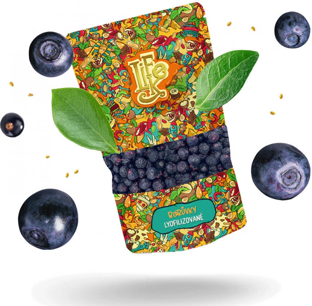 Lifelike Lyofilizované borůvky 50g Lyofilizace je proces sušení ovoce mrazem. Ovoce je nejdříve prudce zmraženo a následně sušeno při nižším tlaku, kde se voda z ovoce mění v páru a ovoce si tak zachovává svou přirozenou strukturu, barvu, vůni a především nutriční hodnotu včetně všech vitamínů a minerálů obsažených v čerstvém ovoci. Prostě vše, co je v čerstvém ovoci najdete i v lyofilizovaném. SL...