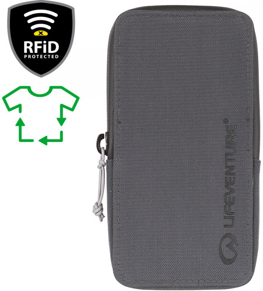 Praktické pouzdro z recyklovaného materiálu na mobilní telefon a platební karty s kompletní RFID ochranou. Tou se výrazně snižuje riziko elektronické krádeže identity. Rozměry obalu se hodí pro iPhone a většinu chytrých telefonů. Vnitřní strana je vyrobena z měkkého kartáčovaného polyesteru, polstrovaná a prošívaná podšívka zabrání poškození nebo poškrábaní.