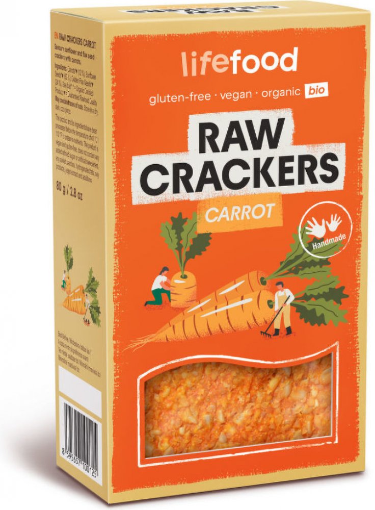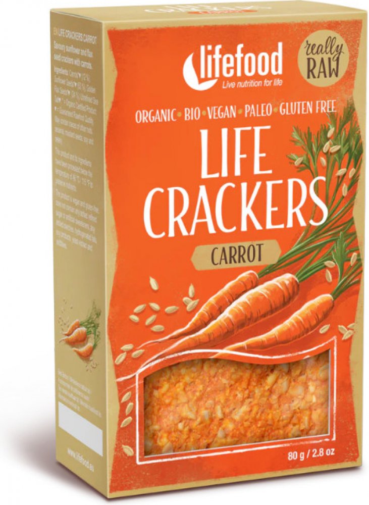 Mrkvové krekry se báječně hodí na přikusování k polévce, salátu nebo na křoupání jen tak samotné.lt;!-- Generated by XStandard version 2.0.0.0 on 2019-09-04T12:47:25 --gt;lt;pgt;Základ Mrkvánků tvoří mrkev spolu se slunečnicovým a lněným semínkem. Jsou vhodné jako výživná zdravá svačinka. Můžete je křoupat jen tak samotné nebo si z nich připravit obložený amp;quot;chlébamp;quot; či sendvič. Zakousněte je k salátu nebo k dobré raw či vařené polévce. Díky jejich jemné chuti jsou oblíbené i malými dětmi.lt;/pgt;lt;pgt;Raw placky, krekry nebo také nepečený chléb, jsou vhodné jako zdravá a chutná alternativa k pečivu. Neobsahují lepek, laktózu, přidané cukry, plnidla, konzervanty, mouku, kypřící látky ani zvýrazňovače chuti. Zpracování surovin i samotná výroba a sušení krekrů probíhá za nízkých teplot do 45 °C, takže si zachovávají nejen výbornou chuť, ale i maximální výživnou hodnotu. Jsou vhodné jako náhražka pečiva pro bezlepkáře, smlsnou si na nich i vegani, vitariáni či zastánci paleo stravy, zkrátka každý, kdo se zajímá o zdravý životní styl a chce přidat do svého jídelníčku něco nového.lt;/pgt;Mrkev* 12 %, slunečnicové semínko* 62 %, lněné semínko zlaté* 24 %, mořská nerafinovaná sůl. Může obsahovat stopy jiných skořápkových plodů, sezamu, hořčičného semínka, sóji a celeru. *produkt kontrolovaného ekologického zemědělstvíK přímé spotřebě.lt;pgt;lt;stronggt;Kalorická hodnota/energie (na 100g):lt;/stronggt;2375kJ/569kcal. Tuky: 45 g. z toho nasycené mastné kyseliny: 4 g. Sacharidy: 15 g. z toho cukry: 7 g. Bílkoviny: 20 g. Sůl: 1,9 glt;/pgt;lt;pgt;lt;stronggt;Skladování:lt;/stronggt; Uchovejte v suchu a temnu, chraňte před teplem.lt;br /gt;lt;stronggt;Legislativní zařazení:lt;/stronggt; lt;/pgt;