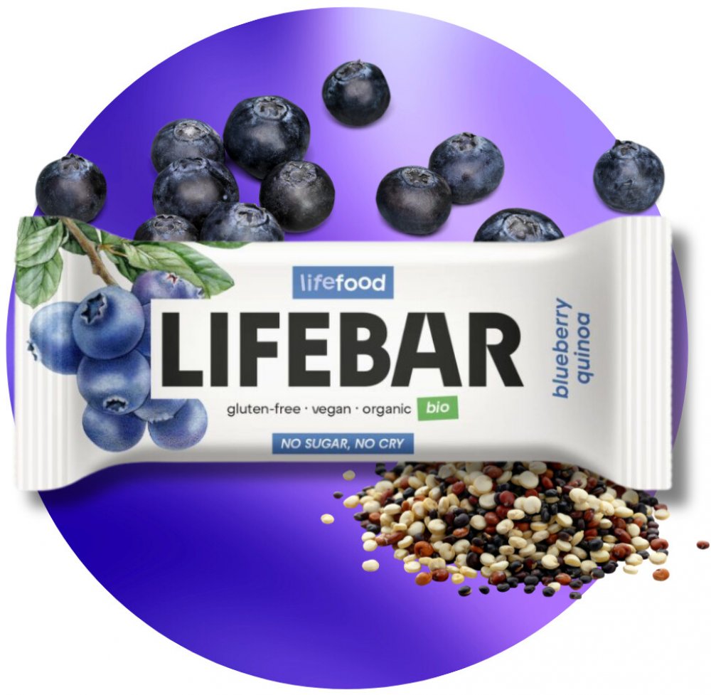 Složení: Ovoce* 66 % (datle*, lyofilizovaný borůvkový prášek* 5 %, moruše bílá*, lyofilizovaný prášek z černého rybízu*), slunečnicová semínka*, naklíčená quinoa* 5 %, pohanka naklíčená*, chia semínka* (Salvia hispanica) 2 %, extra panenský olivový olej*. Může obsahovat stopy jiných skořápkových plodů a sezamu. Může obsahovat kousky skořápek a pecek. *produkt kontrolovaného ekologického zemědělství.