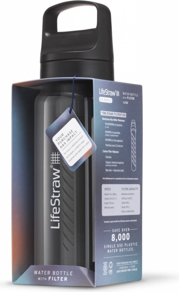 Odolná láhev o objemu 1 litr má vestavěný membránový mikrofiltr, který umožňuje přefiltrování až 4000 litrů vody. To je možné díky snadno ovladatelné filtraci LifeStraw, která zaručuje bezpěčnou konzumaci vody přímo ze znečištěných zdrojů.