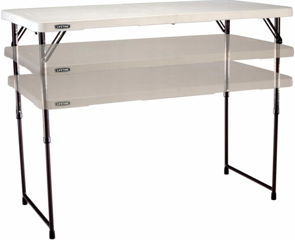 Skládací stůl s nastavitelnou výškou pracovní desky vhodný do pokoje, na zahradu, do dílny. Kombinace ocelové nosné kostry a vysoce odolného UV stabilizovaného polyetylenu (HDPE). Odolnost vůči vlivu počasí. Plast na slunci nežloutne ani nekřehne. Stůl je možné jednoduše složit na polovinu.