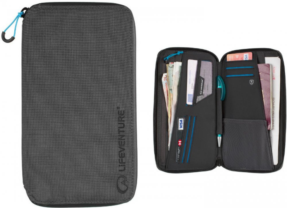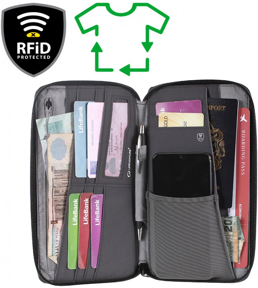 Praktické cestovní pouzdro na dokumenty a doklady, vyrobené z recyklovaného materiálu a s kompletní RFiD ochranou. Voděodolné pouzdro nabízí jednu venkovní kapsu (bez RFiD ochrany) a dalších 16 kapes uvnitř. RFiD Travel Wallet spolehlivě ochrání vaše citlivá data (průkazy, kreditní karty, ...) i další pro Vás důležitě dokumenty a doklady.