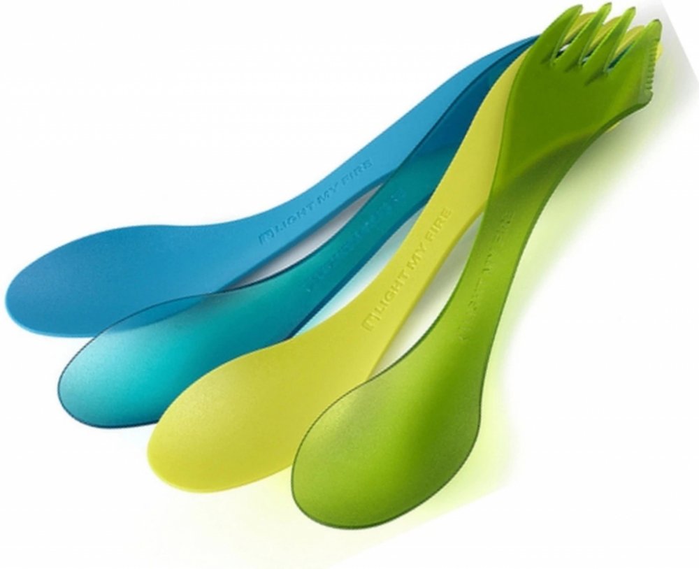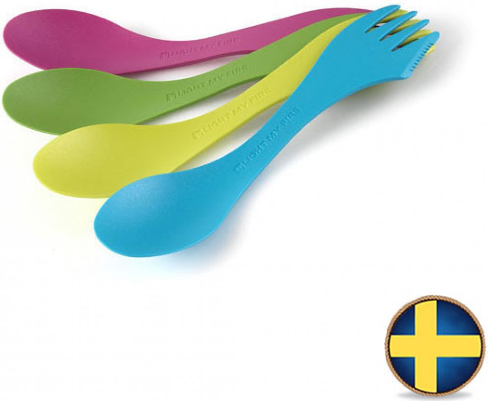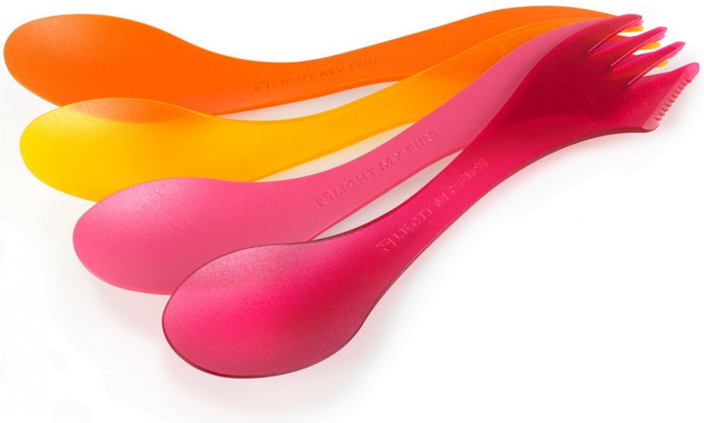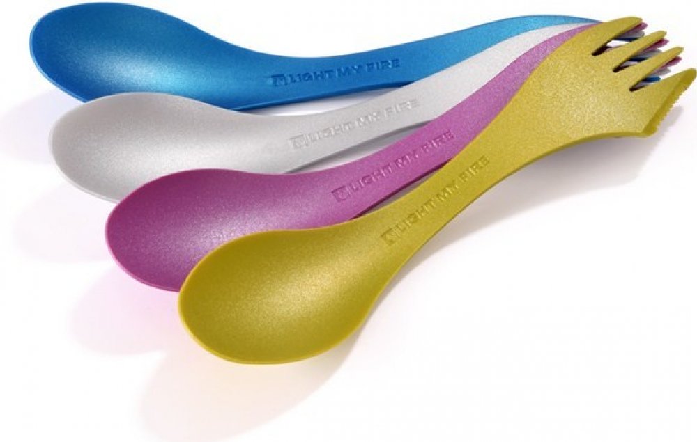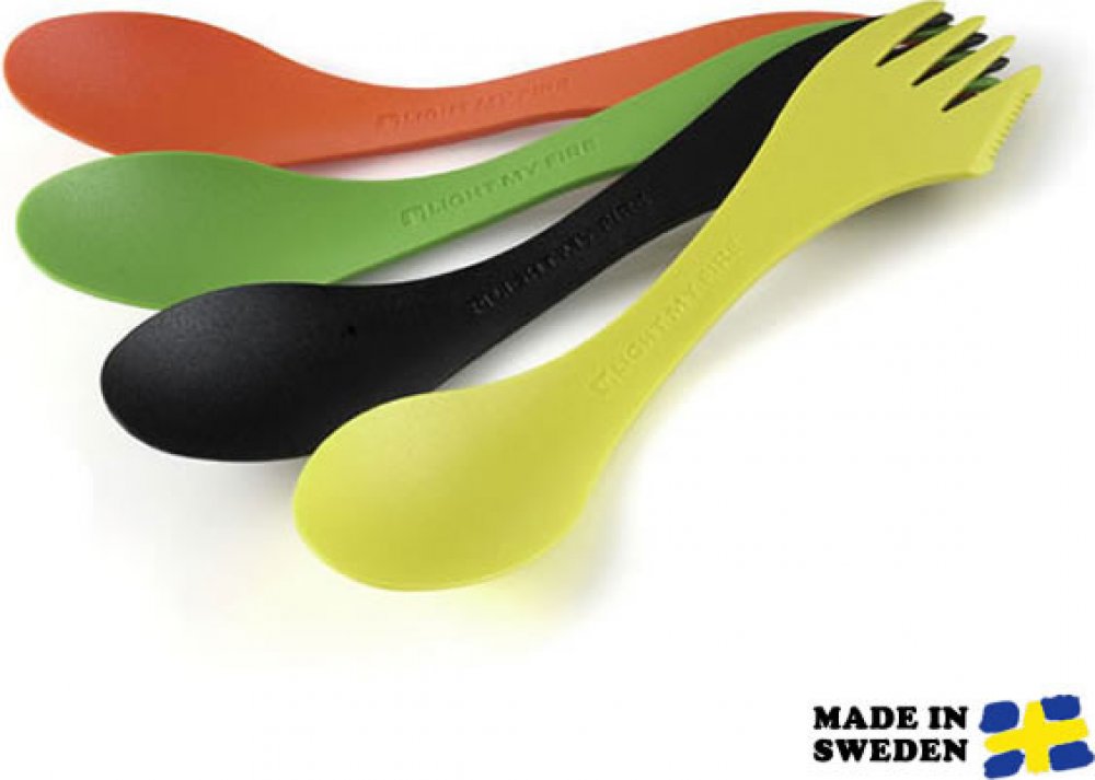 Spork: kombinace lžičky, vidličky a nože. Naše kombinace lžičky, vidličky a nože přináší trochu civilizace do divočiny a trochu divočiny do civilizace. Vytvořeno speciálně pro společnost Light My Fire skandinávským návrhářem Joachimem Nordwallem. Spork je úžasná pomůcka – vejde se do batohu, kapsy, do piknikového koše, kabelky nebo aktovky.