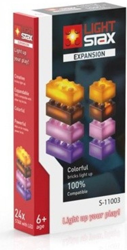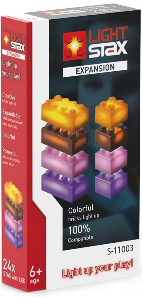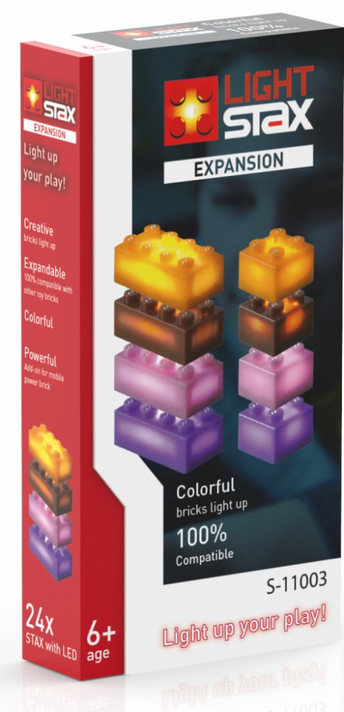 Stavebnice Light Stax jsou svítící kostky, které využívají LED technologii. Pomocí patentovaného systému se každá kostka magicky rozsvítí, jakmile se připojí k základové desce (není součástí balení). Nepotřebujete žádné speciální konektory nebo kabely. Kostky Light Stax jsou plně kompatibilní s jinými stavebnicemi typu LEGO. V balení se nachází 24 dílků. Stavebnice je vhodná pro děti od 6 let.