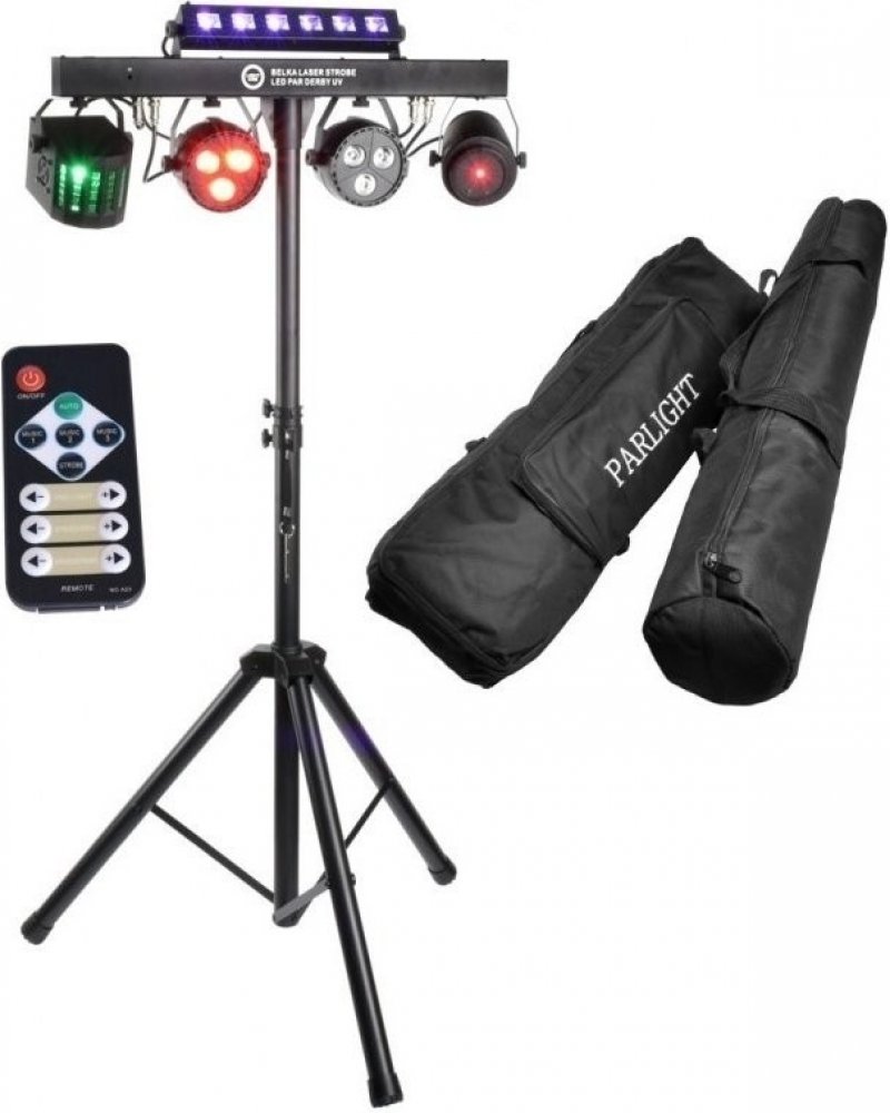 Přenosný set světelných efektů s nízkou hmotností společnosti Light4Me. Zařízení umožňuje ovládání prostřednictvím bezdrátového dálkového ovládání. Set obsahuje 2 x Par světelný efekt, derby světelný efekt, UV lištu s funkcí stroboskop a 2 x laser světlo.
