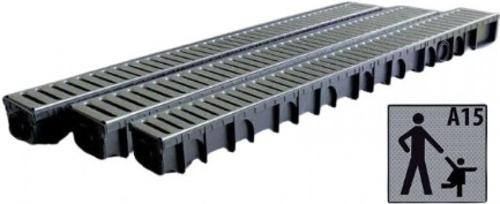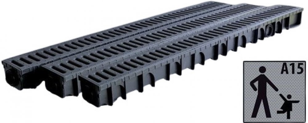 Sada plastových odvodňovacích žlabů WDR s PP UV stabilní mříží a třídou zatížení A15 pochozí. Sada obsahuje 3x žlab v délce 1m, 3x mříž šířka 12,8 cm, 2x koncovka 11 cm. Odvodňovací žlab s vnitřní hloubkou 7,5 cm slouží k efektivnímu odvodu dešťové vody