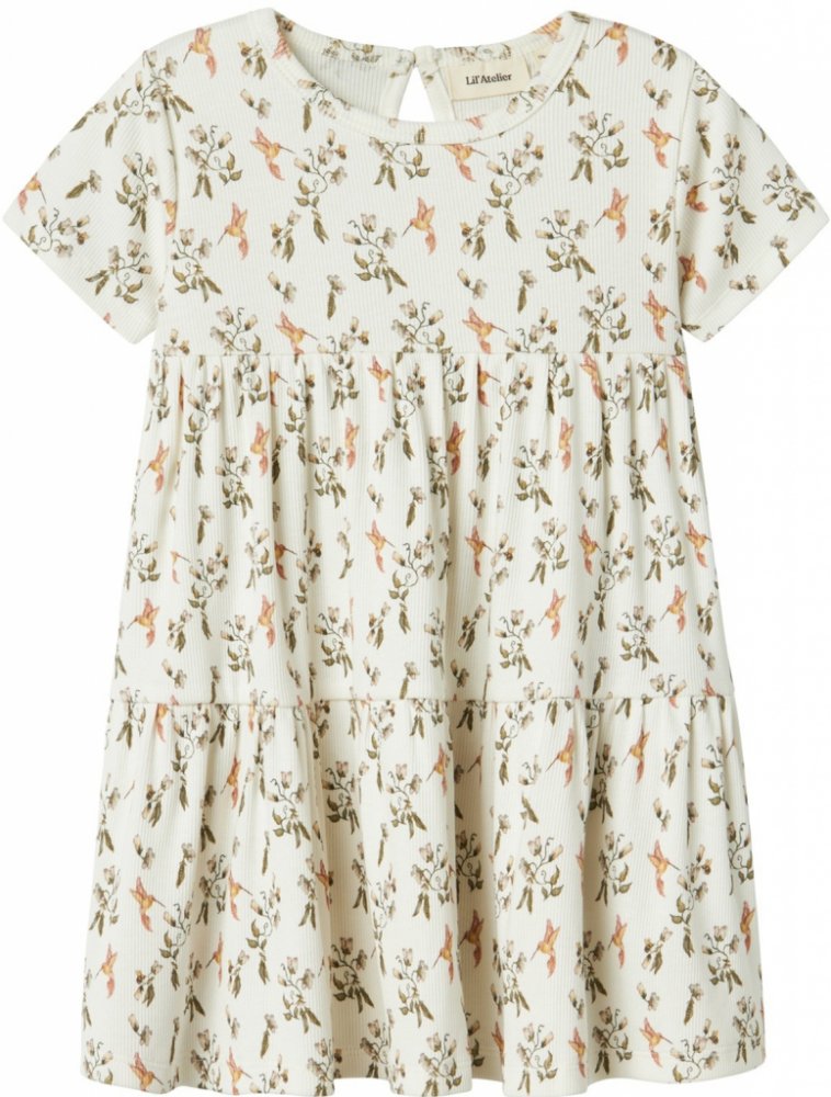 Krásné šaty s krátkým rukávem z kolekce Lil' Atelier pro každé roční období a příležitost. Jersey je lehká a pružná tkanina s měkkým vnějším i vnitřním povrchem, která nabízí pohodlí a volnost pohybu. Překrásný potisk potisk s kytičkami a ptáčky dodává šatům šarm a letní náladu.