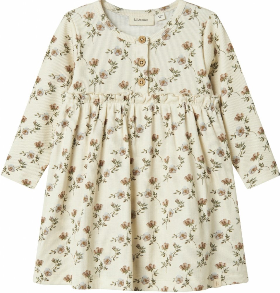 Krásné šaty s dlouhým rukávem z kolekce Lil' Atelier pro každé roční období a příležitost. Jersey je lehká a pružná tkanina s měkkým vnějším i vnitřním povrchem, která nabízí pohodlí a volnost pohybu. Šaty mají všité body díky kterému šaty drží tam, kde mají. Nádherný potisk s kytičkami dodává šatům šarm a jedinečnost.