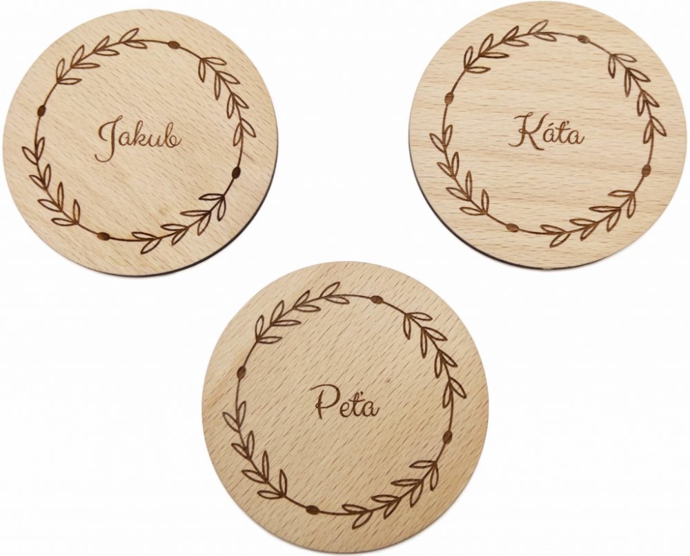 Jsou oboustranně lakované Každá jmenovka je z obou stran poctivě nalakovaná, aby překližka nemohla nasát vlhkost. Díky tomu hostům doma jmenovky při využívání jako podtácky opravdu vydrží. Jednoduše elegantní a praktické