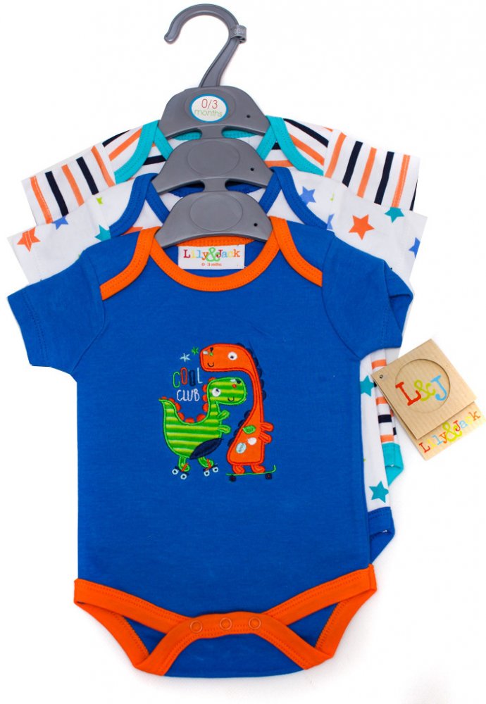 Komplet 3 x body s krátkým rukávem s motivem dinosaurů, hvězd a proužků. Krásný užitečný dárek.