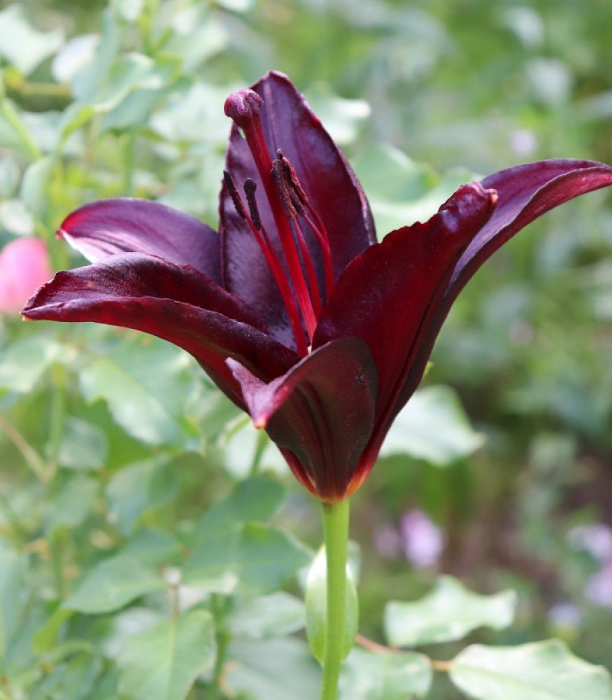 Široké, ploché květy se objevují od května do července. Mají tmavě červenou až černou barvu.