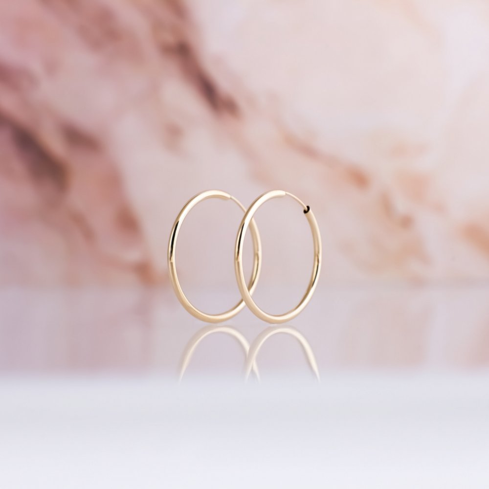 Stylové náušnice ze 14kt zlata ve tvaru kruhu o průměru 2,5 cm. Náušnice mají lesklý a hladký povrch a střední průměr. Tento osvědčený typ náušnic je velmi oblíbený a žádaný. Náušnice mají klasické, velice praktické a bezpečné zapínání na zasunutí.