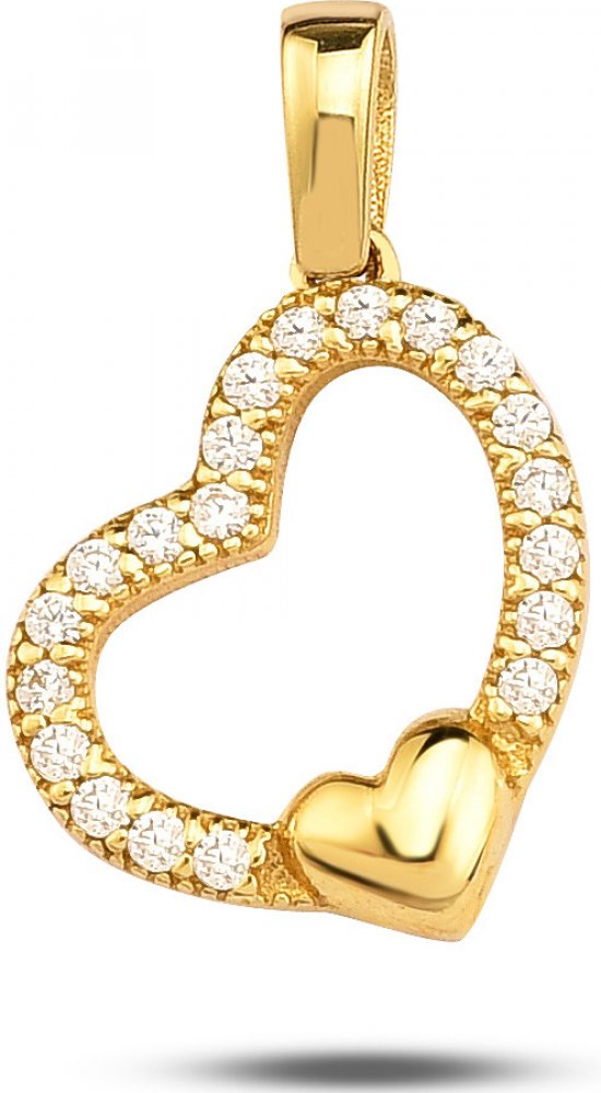 Tento nádherný přívěsek ve tvaru srdíčka si prostě zamilujete na první pohled. Přívěsek je vyrobený ze žlutého 14kt zlata a je zdobený třpytivými zirkony, díky kterým bude přívěsek nepřehlédnutelný v každém dekoltu. Dolní část přívěsku je ozdobena menším srdcem. Povrch šperku je hladký v lesklé povrchové úpravě. Darujte dvakrát tolik lásky osobě, na které Vám opravdu záleží. Skvělý tip na dárek.