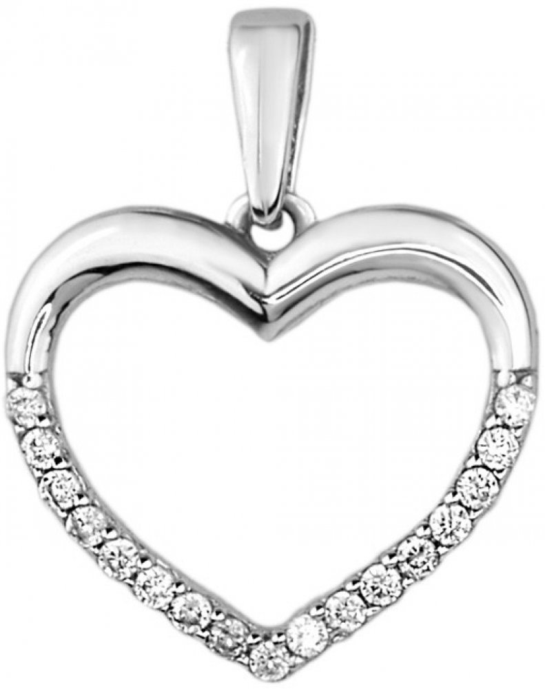 Jemný přívěsek ve tvaru srdce v bílém 14kt zlatě. Srdce je z poloviny posázené zářivými zirkony a zbytek povrchu je hladký ve vysokém lesku. Přívěsek můžete kombinovat s jemným řetízkem z bílého zlata. Udělejte občas něco netradičně a vyznejte lásku beze slov.
