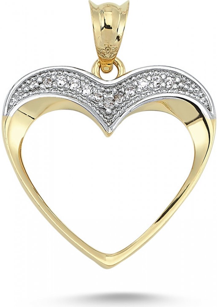 Půvabný přívěsek ve tvaru srdce v kombinovaném 14kt zlatě. Přívěsek má velmi elegantní styl, který svým vzhledem okouzlí každou ženu i dívku. Povrch přívěsku je hladký v lesklé povrchové úpravě a doplněný třpytivými zirkony, které jsou zasazené do bílého zlata a pečlivě uchycené v malých krapnách tzv. "zrnkách" . Přívěsek můžete kombinovat s jemným řetízkem z bílého i žlutého zlata. Klasika v mode...