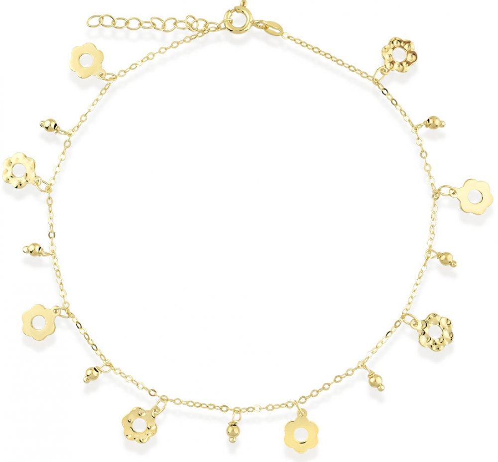 Náramky na nohu opět přichází do módy, buďte nadčasová s tímto úchvatným šperkem. Šperk je vyroben ze žlutého 14kt zlata a řetízku typu rolo, který je ozdoben zlatými komponenty a rozkošnými květinami. Díky hladké povrchové úpravě náramek dokonale vynikne na kotníku každé ženy i dívky. Náramek je dlouhý 23 cm a díky zapínání na karabinku a očka jej lze o 3 cm prodloužit. Dokonalý šperk pro letní r...