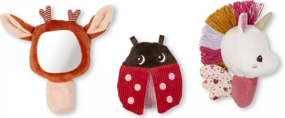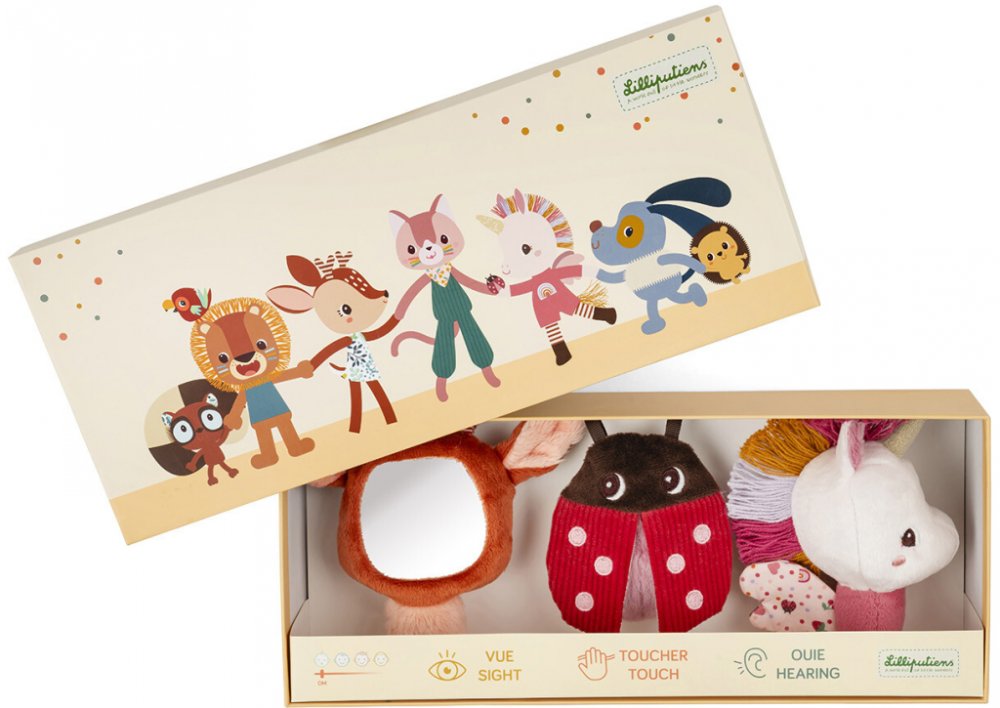 Tato sada 3 látkových chrastítek je vhodná od narození. Plyšová zvířecí chrastítka probouzí zvědavost těch nejmenších a stimulují jejich smysly. Jednorožec Lena a její okouzlující křídla, která vydávají zábavný šustivý zvuk, koloušek Stella s malým zrcátkem a beruška, se skládá z několika textur, které může dítě objevovat konečky prstů. Jejich tvar byl navržen pro snadnou manipulaci těmi nejmenším...