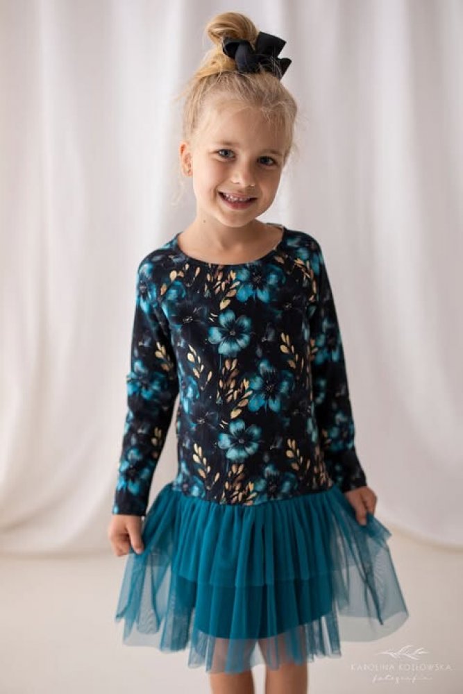 Tmavý základ šatů doplňuje krásný květinový vzor v kombinaci s tylovou sukní. Tento detail dodává šatům jemný a slavnostní nádech, který ocení každá malá slečna.