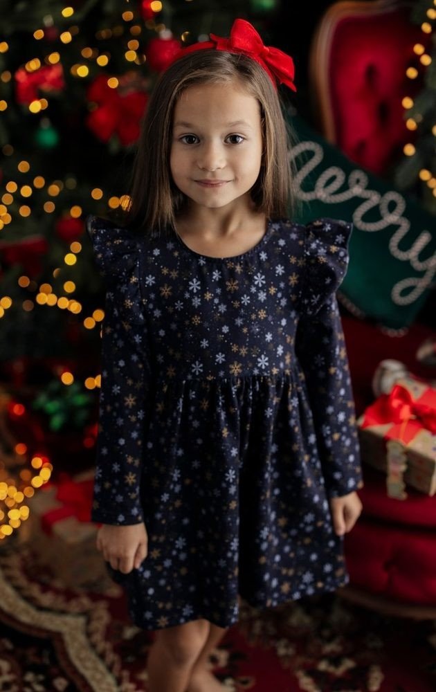 Krásné modré šaty s vločkami, vhodné na Vánoční focení či ke stromečku.