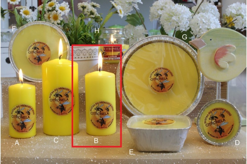Také vás nebaví nekonečné odhánění dotěrného hmyzu při posezení venku? Máme tu řešení. Citronela je žlutá a silně odpuzuje komáry, proto se používá venku na terasách a pod. Svíčka slouží k běžnému pálení, ale může být i skvělým dárkem. Kvalita hoření je velmi vysoká. Svíčky jsou vyrobeny ze zdravotně nezávadného parafinu vysoké kvality.