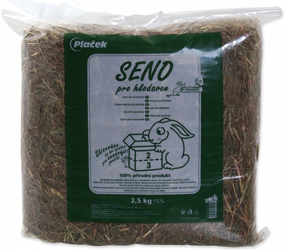 Upozornění: Pro některé hlodavce je seno nedílnou součástí denní stravy. Množství vždy přizpůsobte velikosti zvířete. Krmte tak, aby ho měl vždy dostatek, ale aby se z něj nestala podestýlka (požírání sena znehodnoceného výkaly může mít za následek zažívací potíže). Proto je dobré seno umísťovat do tzv. seníků např. G15-60901.