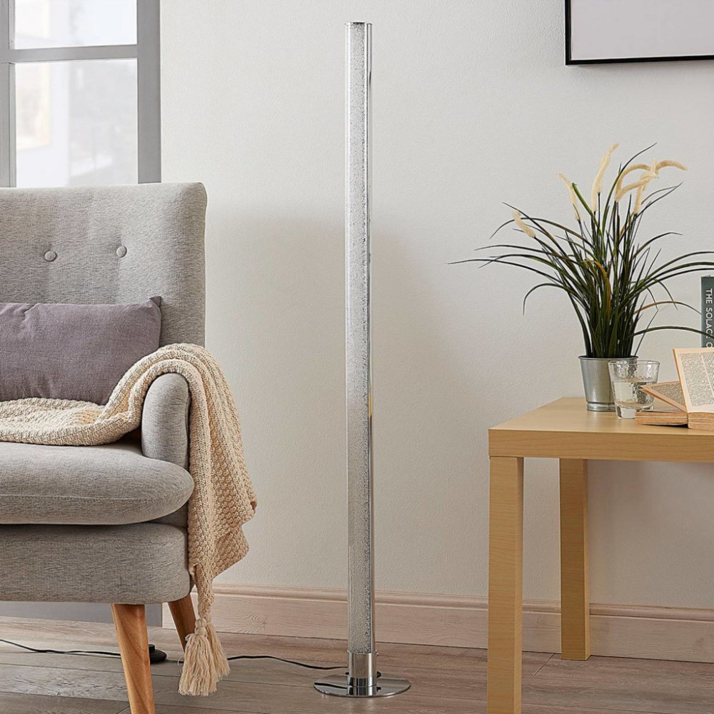 Stojanová lampa Hadis LED svítí přímo nahoru a lze ji provozovat v režimu RGB. K ovládání barvy a jasu světla slouží dálkové ovládání.