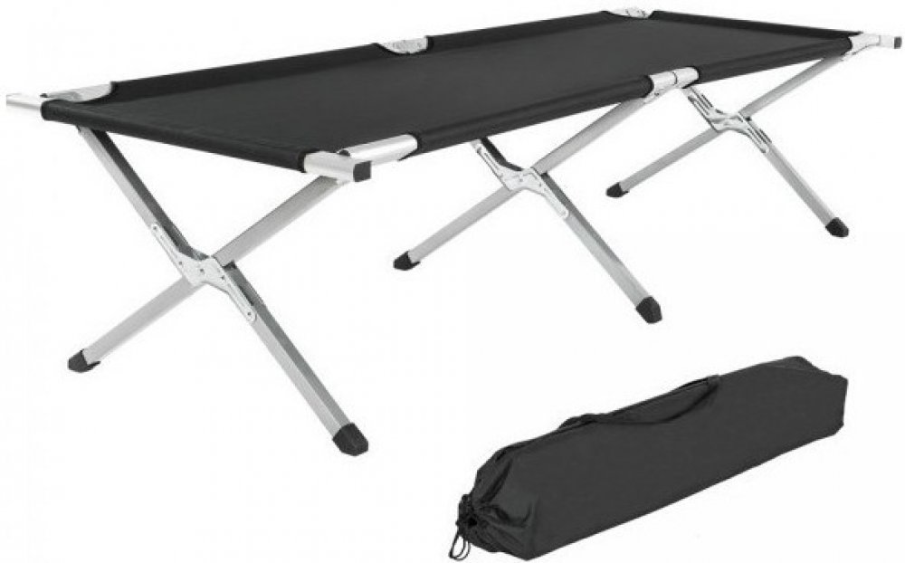 Kempingová skládací postel se dá velice snadno poskládat do malého obalu – tašky s popruhem přes rameno a takto přenést, naložit do auta nebo uskladnit.
