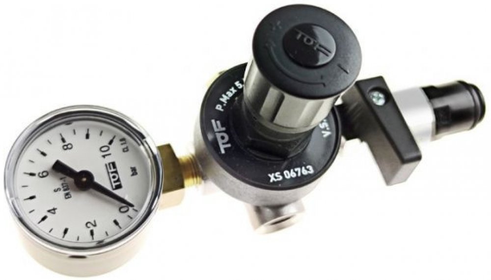 Redukční ventil TOF CO2 mini s ukazatelem pracovního tlaku s uzavíracím kohoutem a rychlospojkou 8mm pro jednorázové bombičky CO2 600g a 1000g.