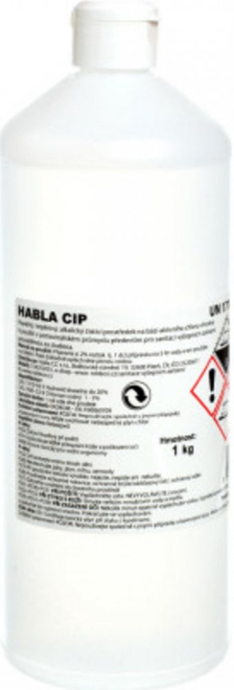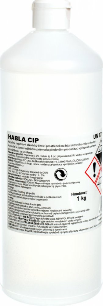 Přípravek sanitační HABLA CIP, 1 KGPřípravek sanitační HABLA CIP, 1 KGPoužití přípravku:Je vhodný k veškerým druhům čištění zařízení, nádrží, tanků, potrubí a hadic v potravinářském průmyslu. Výrobek působí velmi dobře i za studena. Po použití je nutné provést opláchnutí pitnou vodou. Podle stanovených provozních podmínek 0,1 - 3 % , teplota: 0 – 85 °C, kontaktní doba 20 – 30 minut. Není vhodný na barevné kovy a hliník.Složení: chlornan sodný do 10%, aktivní chlor do 10%, hydroxid draselný 5 – 15%, pomocné látky, fosfáty.Fyzikálně-chemické vlastnosti: pH cca 12,5 – 13,5, (1% roztok, 20 oC), hustota cca. 1,2 g/cm3, tekutina.Nádoby uchovávejte dobře uzavřené na chladném a suchém místě při teplotě do + 15 °C. Vždy dodržujte bezpečnostní opatření:Symbol nebezpečí: C žíravý. Nebezpečná látka: Chlornan sodný.R-věty: 31 Uvolňuje toxický plyn při styku s kyselinami. 34 Způsobuje poleptání. 22 Zdraví škodlivý při požití.S-věty: 1/2 Uchovávejte pod uzamčením a mimo dosah dětí. 26 Při zasažení očí okamžitě důkladně vypláchněte vodou a vyhledejte lékařskou pomoc. 36/37/39 Používejte vhodný ochranný oděv včetně ochranných rukavic a ochranné brýle, nebo obličejový štít. 45 V případě úrazu nebo necítíte-li se dobře, okamžitě vyhledejte lékařskou pomoc.Před použitím výrobku je uživatel povinen vyzkoušet vhodnost jeho použití. Firma PRAGOPOLAIR s.r.o. nenese odpovědnost za náhodné škody, ani za škody v důsledku nesprávného použití, nebo prodeje výrobku jinému odběrateli. URČENO POUZE PRO PROFESIONÁLNÍ UŽIVATELE!