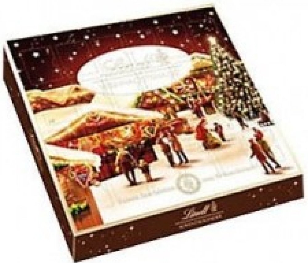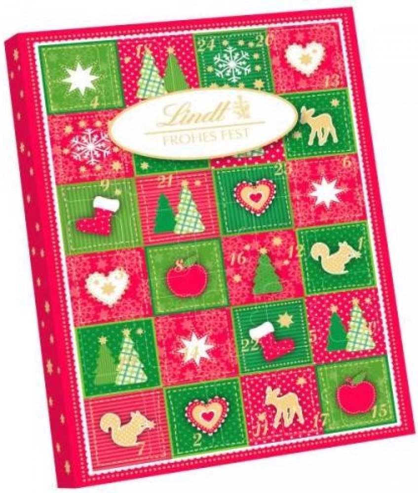 Adventní kalendář – Kolekce bonbónů z mléčné čokolády částečně plněné. Obsah kakaové sušiny nejméně 30%. Mléčná čokoláda: Obsah kakaové sušiny nejméně 30%.