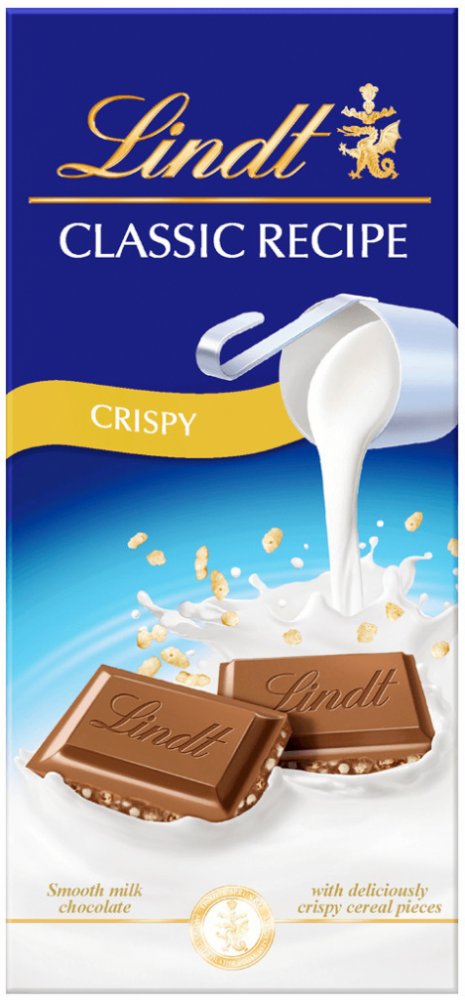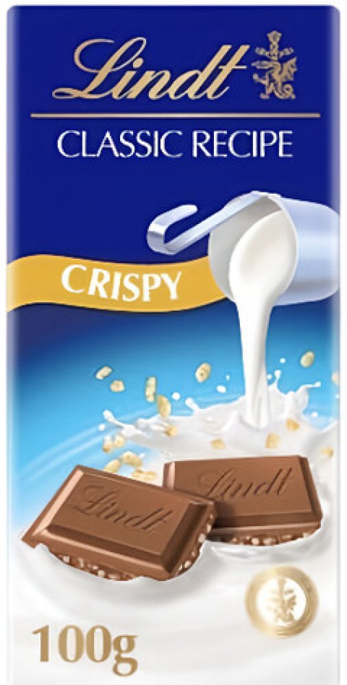Lindt CLASSIC RECIPE Milk Chocolate Crispy 100g Mléčná čokoláda s křupavými kousky sušenek (8%). Nutriční hodnoty: Výživové údaje na 100g Energy (kJ) 2197 Energy (Kcal) 526 Bílkoviny (g) 7 Tuky (g) 29 z toho nasycené mastné kyseliny (g) 17 Sacharidy (g) 58 z toho cukry (g) 51 Sůl (g) 0,28 Ingredience: cukr, kakaové máslo, sušené plnotučné mléko, kakaová hmota, rýžová mouka, laktóza, sušené odstředěné mléko, emulgátor: sójovýlecitin, extrakt ječného sladu, aroma. Alergeny: Může obsahovat stopy skořápkových plodů. Cocoa Solids %: Mléčná čokoláda: Obsah kakaové sušiny nejméně 30 %. Obsah mléčné sušiny nejméně 20 %.