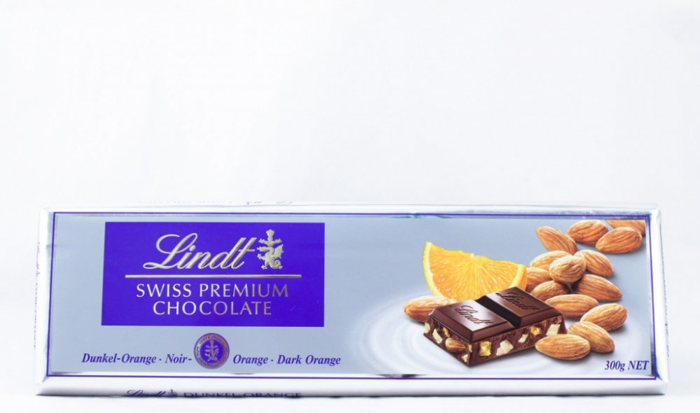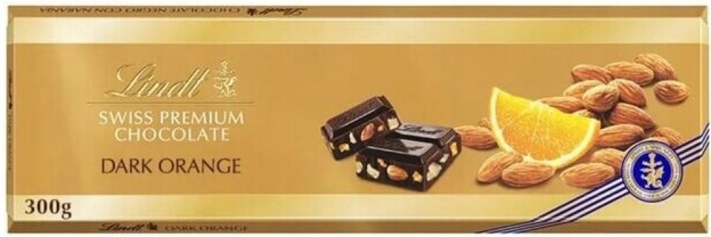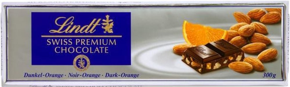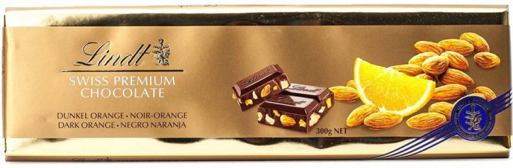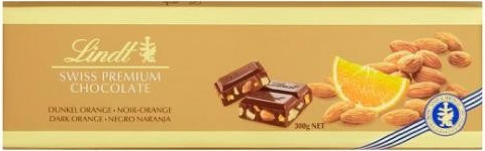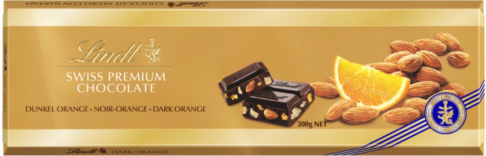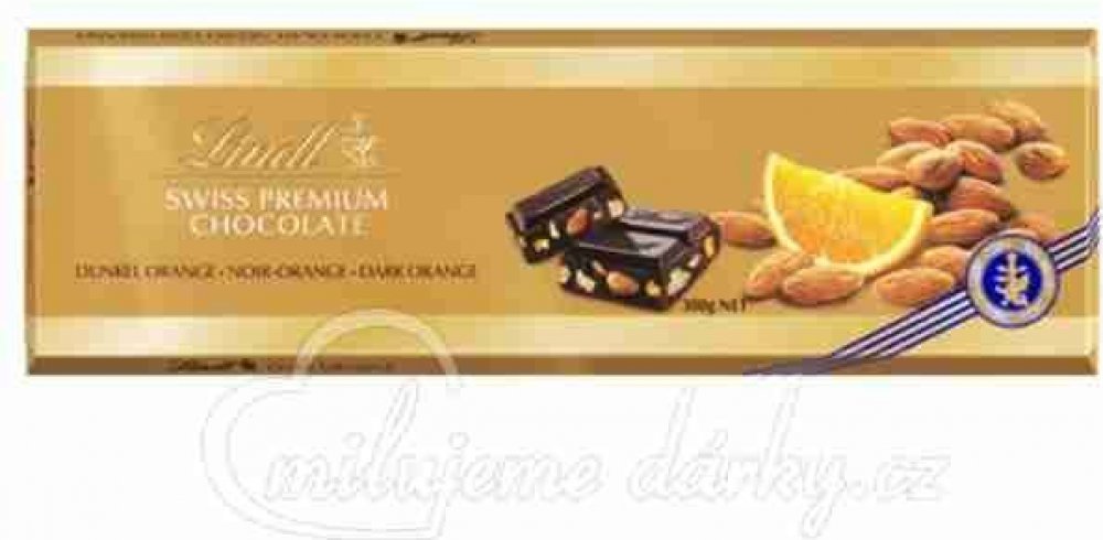 Lindt Gold Tablet Švýcarská hořká čokoláda s pomerančem a mandlemi 300 g Tato klasická švýcarská čokoláda Lindt Swiss Premium je kombinací nejkvalitnější švýcarské tmavé čokolády a osvěžujících pomerančů v kombinaci s křupavými mandlemi. Zaručeně dobrá volba.