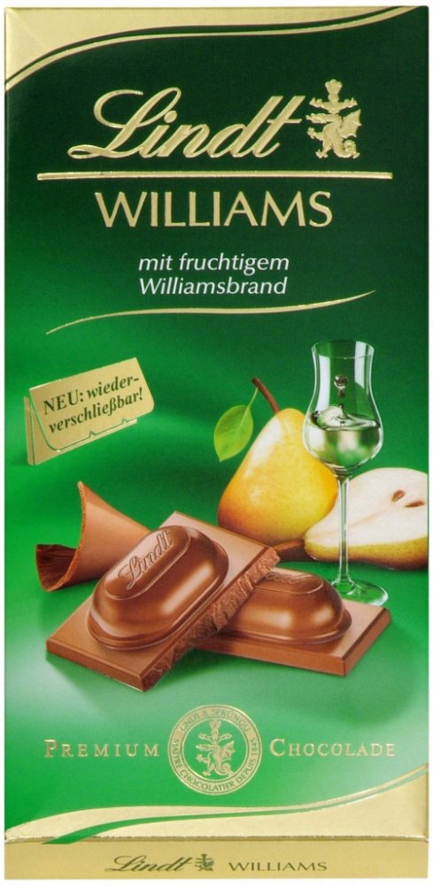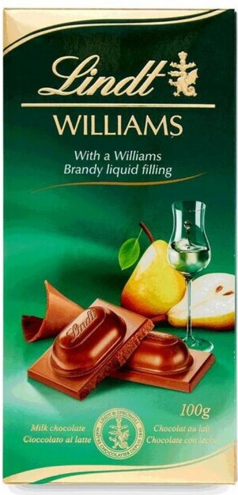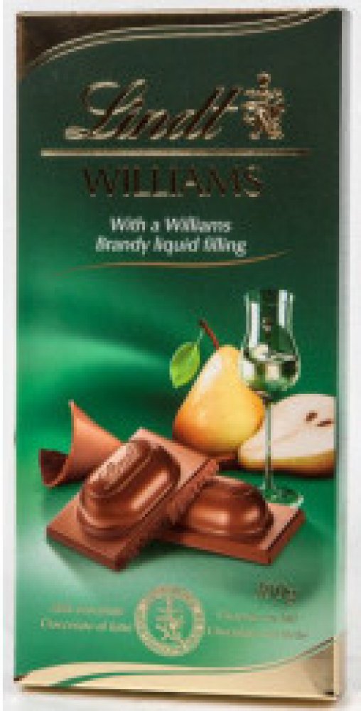 Mléčná čokoláda s tekutou náplní z Williams Brandy (33%). Lindt Willams Brandy je jedinečnou kombinací jemné mléčné čokolády a vynikající brandy z plodů hrušky Willams.